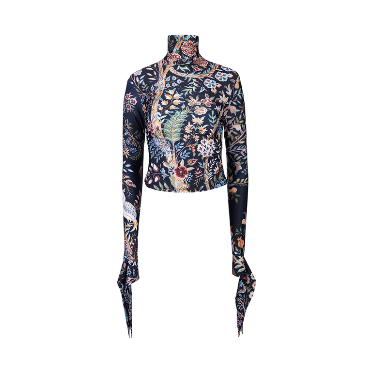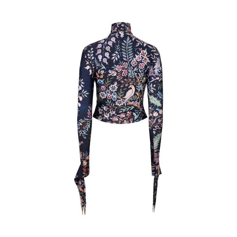 Fitted turtleneck with high neck, adjustable cuffs with bows and concealed zip on shoulder.