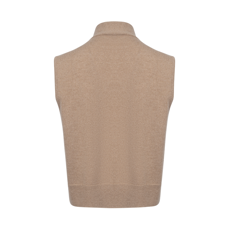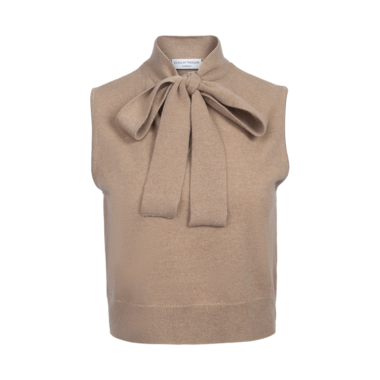 Sleeveless tank top with cravat tie neckline and ribbed trim detailing at hem.