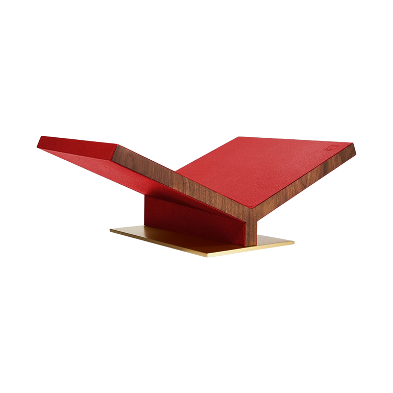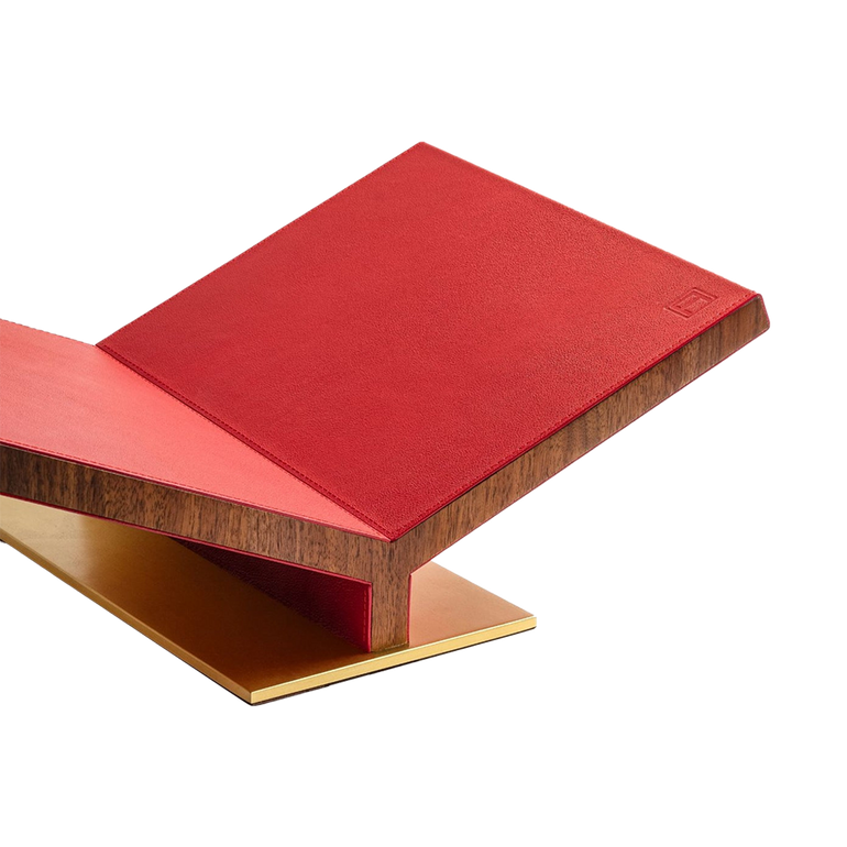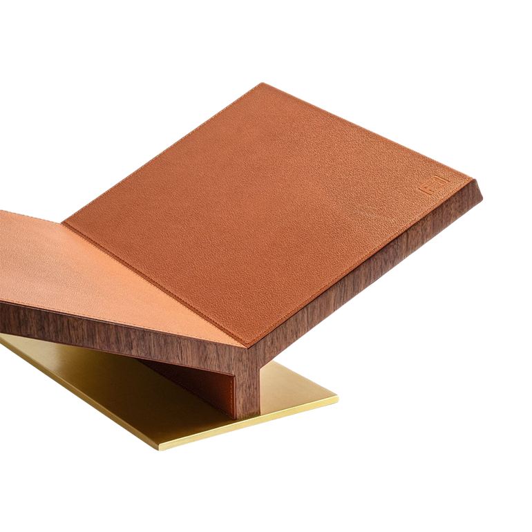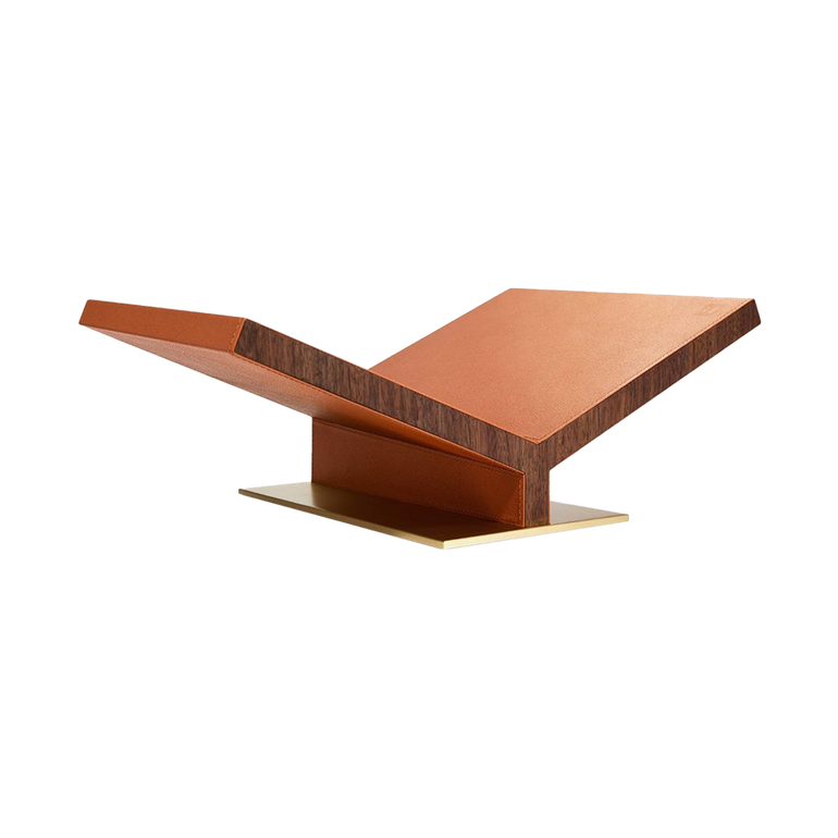 Made from walnut wood and covered in pebbled leather, the Collector Bookstand elevates the object into a piece of sculpture. 16.5" x 11.8" x 6.75"; holds up to 10 lbs.