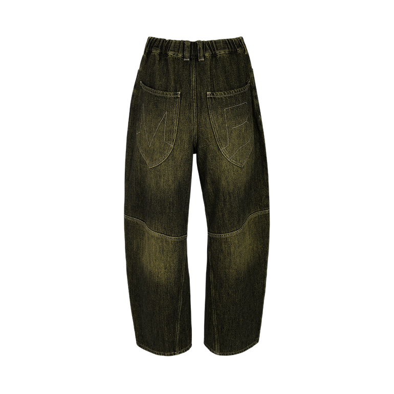 Cropped denim pants with partial elasticated waistband and oversized back pockets.