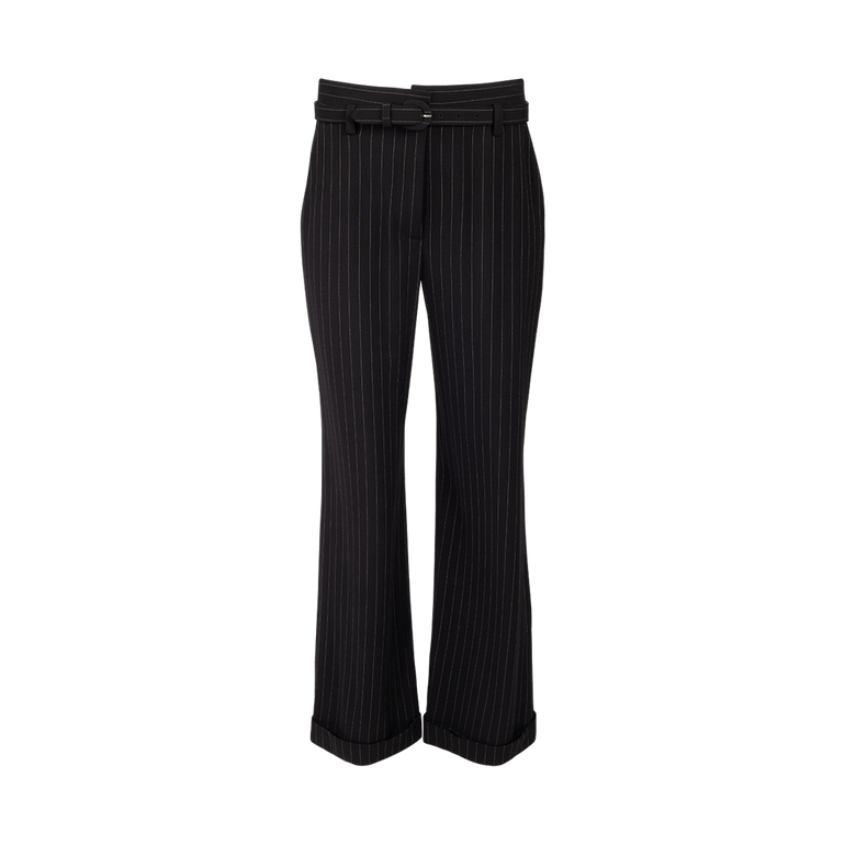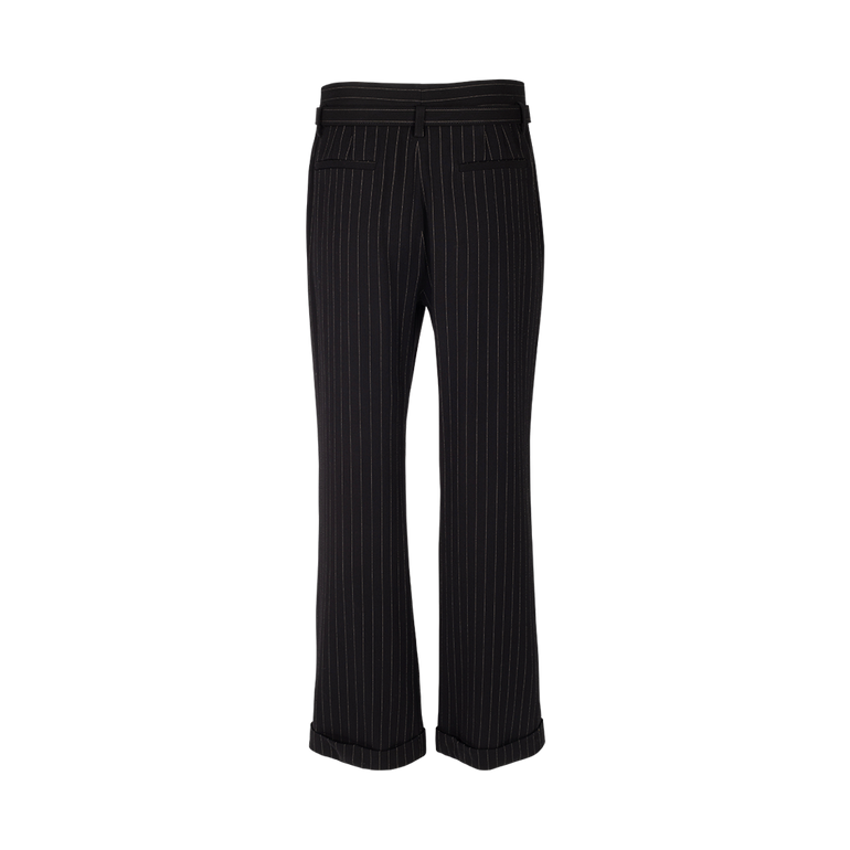 Trouser pants in pinstripe design with mid rise, tailored fit and self-belt.